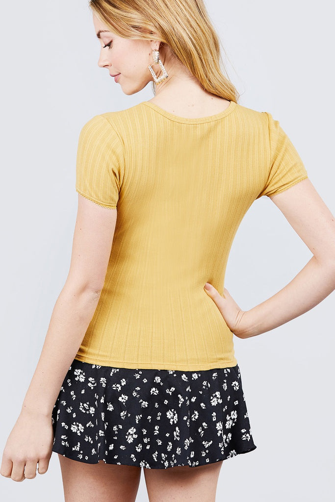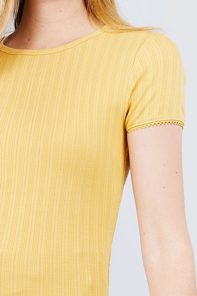 Imported S.M.L SHORT SLEEVE w/LACE TRIM DETAIL CREW NECK POINTELLE KNIT TOP 94% Cotton 6% Spandex Yellow ACT